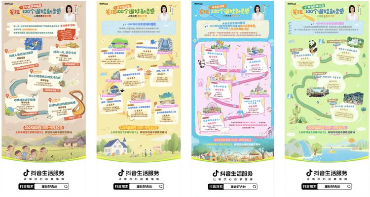 2025年8月-10月,抖音生活服务发起「遛娃好去处」活动,以「自然户外、乐园、人文、亲子酒店」四大场景为核心,通过“发现100个遛娃新灵感”为主线,整合IP联动、明星资源、线下事件与区域化内容深耕,助力商家构建从内容种草到体验转化的完整链路,实现品牌曝光、客群拓展与生意增长的多元目标。