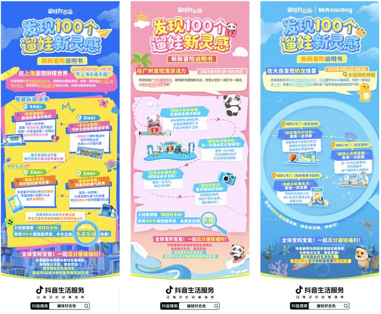 为了给消费者提供清晰的打卡路径促进客单转化,抖音生活服务「遛娃好去处」配套大连锦辉商圈、上海乐高乐园度假区、广州长隆野生动物园线下互动装置打卡点,发布清晰标注位置与游玩动线的点位攻略图,大幅提升了亲子家庭的参与便利性。「在大连发现奶龙世界」、「在上海发现拼搭世界」、「在广州发现清凉活力」等新奇冒险体验为亲子家庭创造了独特的游玩记忆,更激发了用户在社交平台的分享、传播欲。